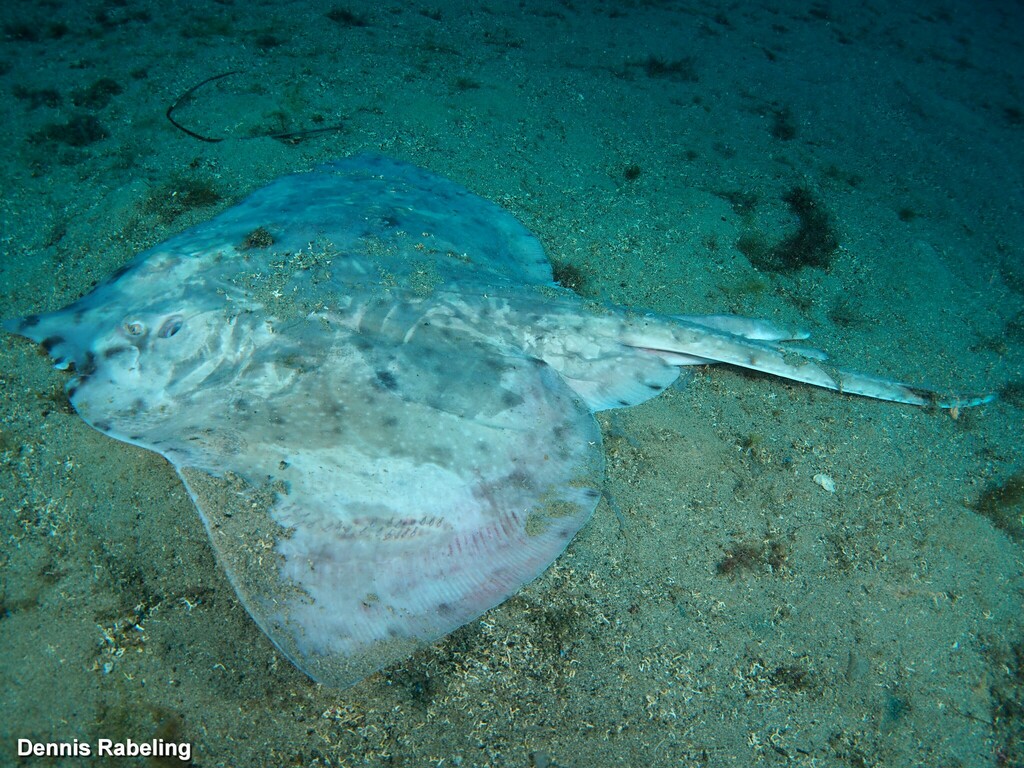 Très grande raie. Peut dépasser 2 m de long. Corps rhomboïdal plus large que long, de couleurs variables et cryptiques allant du sable au gris bleuté avec des taches foncées et pâles. Surface ventrale blanche avec des bordures grises sombres. Museau long, pointu et prononcé. Extrémité des ailes pointue. Face dorsale lisse et ocre avec bordures des ailes et queue noire chez les jeunes, devenant piquante avec l’âge. Queue plus petite que le corps, dotée de 3 rangées de grosses épines sur son dessus et ses côtés.