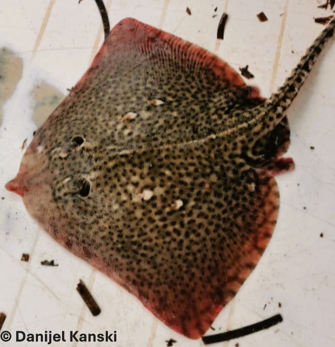 Voir fiche >Face dorsale rugueuse et de couleur brun grisâtre à rougeâtre avec 2 ocelles caractéristiques sombres cerclés de jaunes, lignes transversales foncées sur le disque et les nageoires pelviennes, museau court et arrondi, taille moyenne.