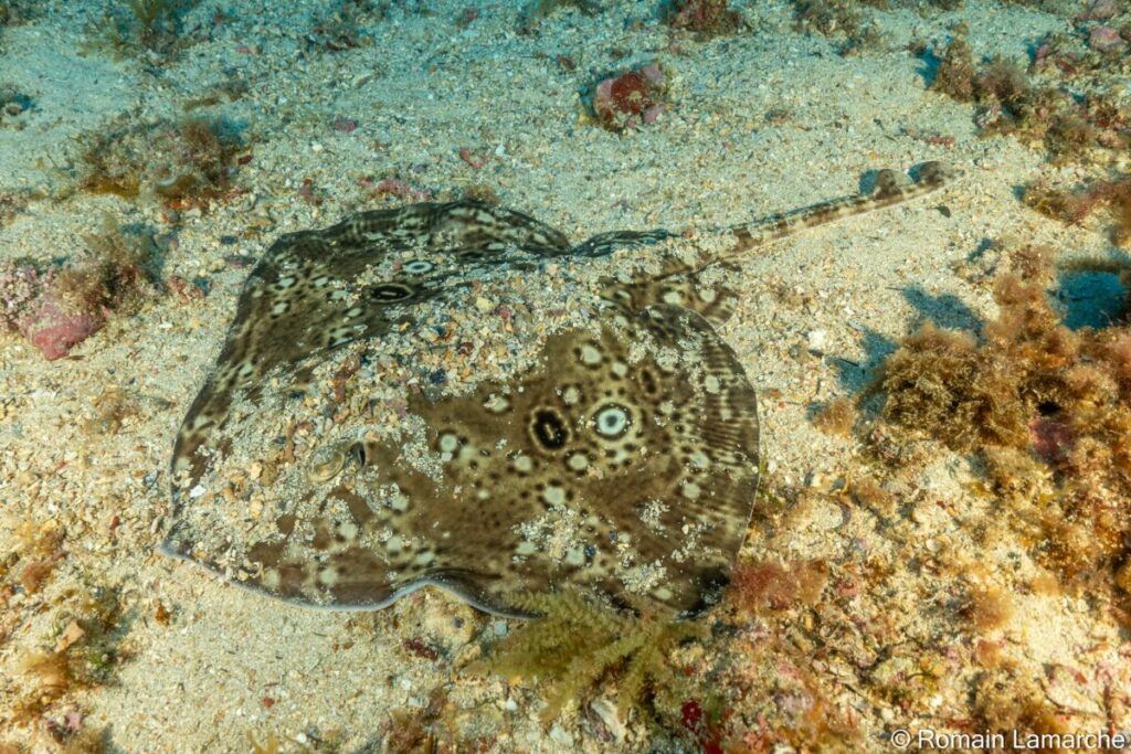 Voir fiche >Face dorsale rugueuse et de couleur brun grisâtre à rougeâtre avec 2 ocelles caractéristiques sombres cerclés de jaunes, lignes transversales foncées sur le disque et les nageoires pelviennes, museau court et arrondi, taille moyenne.